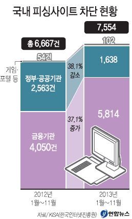 21일 미래창조과학부 산하 한국인터넷진흥원(KISA)에 따르면 작년 1~11월 국내 금융기관을 사칭했다가 차단된 피싱사이트 건수는 5814건으로 전년 같은 기간 4050건보다 37.1%(1572건) 급증했다. 2011년 한 해 발견된 금융기관 사칭 피싱사이트 74건에 비해서는 무려 79배에 달한다.