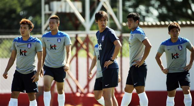 ▲ 홍명보 감독이 20일 오전(현지시간) 전지훈련지인 브라질 파라나주 포즈 도 이구아수시의 아베시(ABC) 경기장에서 대표팀의 훈련모습을 지켜보고 있다. 연합뉴스