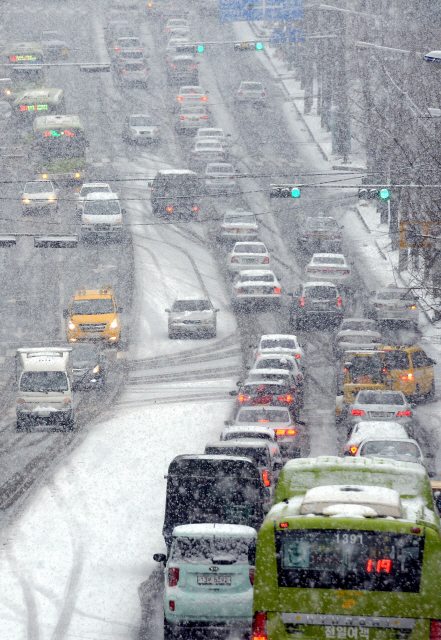 21일 오전 출근시간에 함박눈이 내린 가운데 전주 인후동 한 도로에서 차량들이 거북이 운행을 하고 있다.