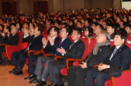 ▲ 21일 전북교육문화회관에서 열린 전주시 덕진구 ‘2014 전주시정 공감토크’에서 송하진 시장 등 참석자들이 박수를 치고 있다.