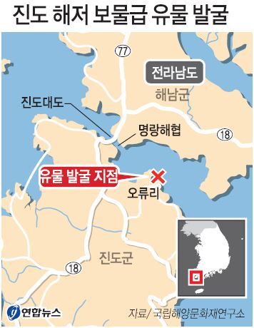 국립해양문화재연구소(소장 소재구)는 지난해 전남 진도군 군내면 명량대첩로(오류리) 앞바다에 대한 수중발굴 결과 삼국시대 초기의 토기를 필두로 고려시대 청자류, 용무늬 청동거울, 임진왜란 당시에 사용한 것으로 추정되는 돌 폭탄인 석환(石丸) 등 500여 점에 달하는 다양한 유물을 발굴했다고 23일 밝혔다.