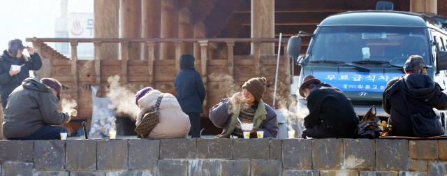 소외된 이웃의 삶은 명절을 앞두고 더욱 쓸쓸하기만 하다. 설명절을 일주일 앞둔 23일 전주 남천교에서 한 교회가 마련한 무료급식에 시민들이 뜨거운 김을 내뿜으며 허기진 배를 채우고 있다.