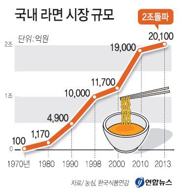 1963년 국내에 라면이 처음 소개된 후 50년 만이자 1998년 1조원을 돌파한 이래15년 만이다.