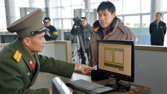 개성공단 전자출입체계(RFID) 시스템이 28일 본격적인 시범 가동에 들어간 가운데 북측 출입사무소(CIQ)에서 북측 운영자가 전자 시스템을 이용해 개성공단 출입 심사를 하고 있다. 연합뉴스
