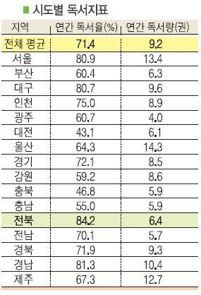 전북의 경우 연간 독서율이 84.2%로, 전국 최고치를 나타냈다(전국 평균 71.4%). 그러나 연간 독서량은 6.4권으로, 전국 평균 9.2권에 못미쳤다. 평일 독서시간 역시 15.9분으로 전국 평균(23.5분)을 밑돌았다. 공공기관 활용률과 독서프로그램 참여율은 각각 14.1%, 1.9%로, 전국 평균 30.3%, 3.9%와 큰 차이가 났다.