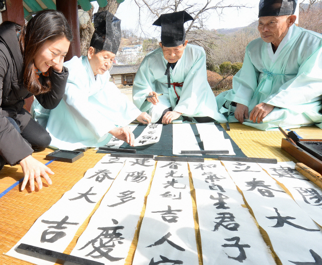 입춘을 하루 앞둔 3일 전주 한옥마을 향교에서 김춘원 전교를 비롯한 유림들이 전주를 찾은 관광객들과 함께 ‘입춘대길’, ‘건양다경’ 을 쓰며 봄과 함께 길하고 경사스러운 일이 많이 생기기를 기원하고 있다.