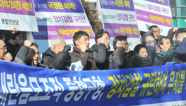 통합진보당 전북도당은 4일 전주지검 앞에서 검찰이 통합진보당 이석기의원에게 징역 20년을 구형한 것과 관련 기자회견을 열고 국정원과 검찰을 규탄하고 있다.