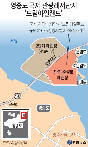 인천항에서 나온 준설토를 버리려고 조성한 서울 여의도 면적의 1.1배인 316만㎡규모 부지에서 내년 하반기부터 정부의 항만개발계획에 따라 대규모 국제 관광레저단지 ‘드림아일랜드’ 사업이 시작된다.