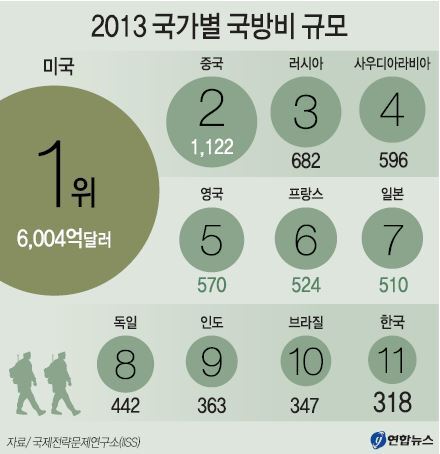 미국은 지난해 국방비로 6004억 달러를 사용해 세계 최대의 군비 규모를 유지했으며, 한국은 318억 달러를 지출해 세계 11위를 차지했다. 중국의 국방비는 1122억 달러로 늘어나 3위 러시아(682억 달러)를 두 배 가까이 앞서며 미국을 추격한 것으로 나타났다.