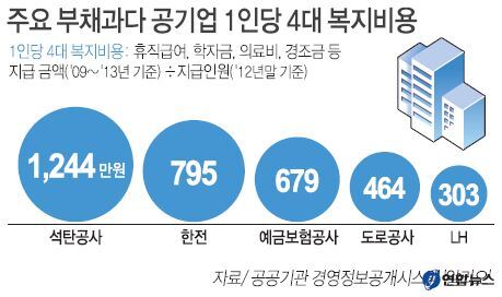 과도한 부채를 갖고 있는 한국토지주택공사(LH)와 한국전력, 대한석탄공사 등 공공기관들이 직원 자녀 학자금과 경조금 등으로 최근 5년간 지출한 비용만 3000억원이 넘는 것으로 집계됐다.