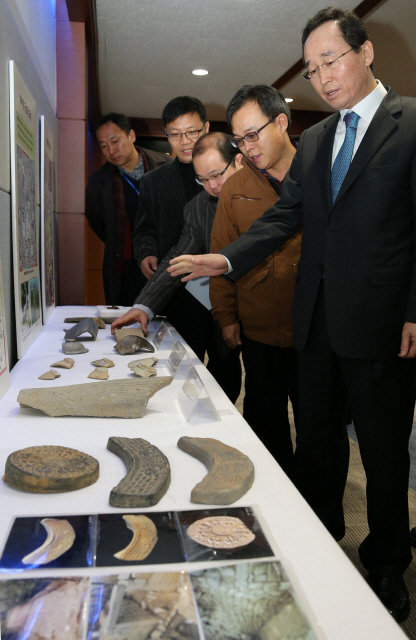 ▲ 후백제 역사문화 복원을 위한 전주시와 국립전주박물관 업무협약식이 11일 전주시청 4층 회의실에서 열린 가운데 송하진 전주시장이 협약식을 마치고 전주 동고산성에서 출토된 유물을 살펴보고 있다. 안봉주기자 bjahn@