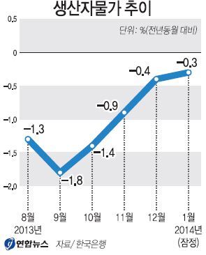 한국은행이 18일 내놓은 ‘2014년 1월 생산자물가지수’를 보면 이 지수는 1년 전에 견줘 0.3% 떨어졌다. 2012년 10월 0.5% 하락한 이후 16개월 연속 내림세다.