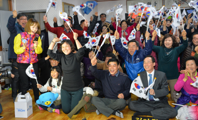 김아랑 선수가 18일 올림픽 3000m 계주에서 금메달을 따자 부모인 김학만, 신경숙씨, 여동생이 전주 서서학동 주민센터에서 응원을 하며 기뻐하고 있다.
