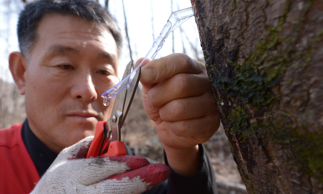 추운 겨울이 가고 이른바 봄을 맞게 되었다는 뜻의 절기상 ‘우수’(雨水)인 19일 오후 완주 동상면 허행건(56)씨가 고로쇠 수액 채취 작업을 하고 있다.