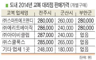 특히 전주의 경우 4개 브랜드 업체가 교복 가격을 28만원~28만7000원으로 책정한 반면 나머지 업체는 24만8000원을 판매하고 있어 대조를 이뤘다. 부안도 2개 브랜드 업체 모두 28만원을 제시하고 있었다.