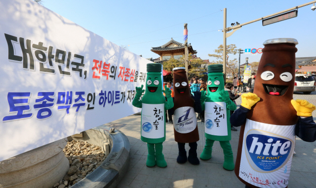 21일 전주 한옥마을에서 하이트진로(주) 특판 전주지점 직원들이 전북에서 생산된 깨끗한 맥주 ‘하이트’판촉 거리홍보를 하고 있다.