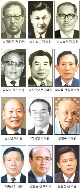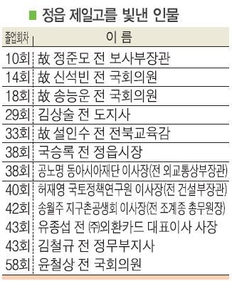 초대 민선지사인 김상술 전 도지사(29회)는 군산 화력발전소·섬진강댐 등을 건설하는 등 지방자치의 사회·경제적 토대를 구축하는 데 일조했다. 윤철상 전 국회의원(58회)과 국승록 전 정읍시장(38회)도 정계 동문 중 빠지지 않는다.