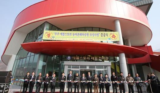 무주 애플스토리 농어촌테마공원 준공식이 25일 홍낙표 군수와 이강춘 군의회 의장, 박승해 농어촌공사 무진장지사장 등 각급 기관단체장과 주민 200여 명이 참석한 가운데 개최됐다.