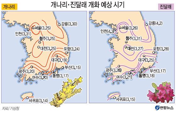 기상청은 2월 평균 기온이 1.8도로 평년보다 0.9도가량 높았고, 3월 상순과 중순 기온은 평년과 비슷하고 하순은 평년보다 높을 것으로 예측돼 전반적으로 봄꽃 개화시기는 평년보다 빠를 것이라고 설명했다. 연합뉴스
