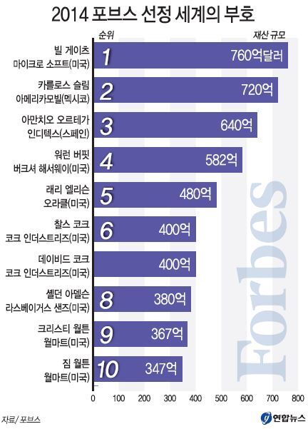 미국 마이크로소프트(MS)의 공동창업자 빌게이츠(58)가 5년 만에 세계 최고 부호 자리를 되찾았다. 미국 경제전문지 포브스는 3일(현지시간) 발표한 ‘2014 세계 부호 순위’에서 게이츠가 세계에서 가장 많은 760억달러(81조4000억원)의 자산을 보유한 것으로 집계됐다고 밝혔다. 연합뉴스