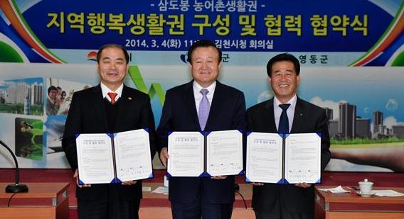 홍낙표 무주군수와 박보생 김천시장, 정구복 영동군수 등 세 지역 단체장들과 관계 공무원들은 4일 김천시청에 모여 ‘생활권 구성 및 상생발전에 관한 협약’을 통해 △생활권 관련 정보 공유 △상호발전 정책 추진 △생활권 내 발전을 위한 상호공감대 형성 등 지자체 간 협력관계를 이어가자는데 뜻을 모았다.