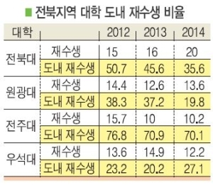 그렇다면 전북지역 재수생 비율은 어느 정도 될까. 전북지역 재수생 관련 통계는 없지만, 전북지역 주요 대학의 입학생 중 도내 재수생 규모를 가늠해볼 수 있었다. 전북대의 경우 재수생 중 도내 학생 비율은 지난 2012년 50.7%(2012), 지난해 45.6%(2013), 올해는 35.6%(2014)로 나타났다.