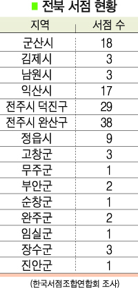 ‘2014 한국서점편람’은 한국서점연합회가 지난해 10월부터 12월까지 전국 서점을 전수 조사한 것이며, 헌책방·총판·할인매장·기독교서점 등은 조사 대상에서 제외했다. 지역별로는 서울과 6대 광역시에 1300개의 서점이 집중돼 전체의 55.8%를 차지했다. 전북의 전체 서점수는 132개로, 전국의 5.6%를 차지했다. 그중 전주시에 절반이 넘는 67개가 전주에 위치해 있고, 군산과 익산은 각 18개, 17개로 조사됐다. 무주·순창·임실·진안은 1개 서점만이 명맥을 유지하고 있다.