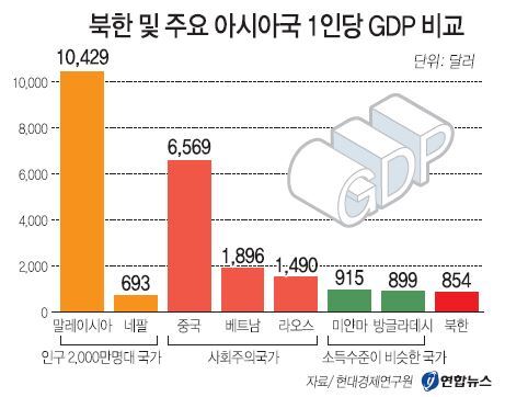 보고서에 따르면 지난해 북한의 1인당 명목 GDP는 남한의 1인당 명목 GDP 2만3838달러의 3.6% 수준이다. 다른 공산권 국가와 비교해도 중국(6569달러), 베트남(1896달러), 라오스(1490달러)에 견줘 매우 적다. ·연합뉴스