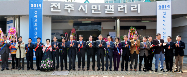 한국 사진기자협회 전북지부 주관으로 14일 전주 덕진공원 시민갤러리에서 열린 ‘2014 보도사진전’ 개막식에서 신상기 전북지부 회장과 홍인기 한국사진기자협회장, 김성주 국회의원 및 내빈들이 테잎 컷팅식을 하고 있다. 전북보도사진전은 1차전시는 덕진공원에서 21일까지이며 2차전시는 24일부터 29일까지 남원춘향문화회관에서 진행된다.