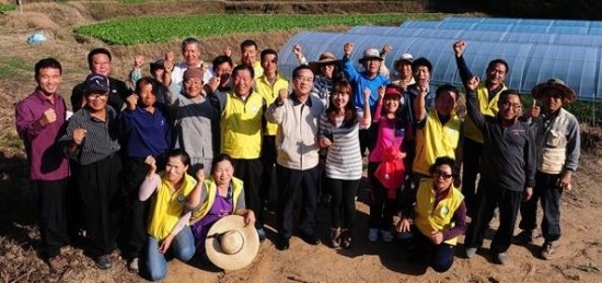 ▲ 고창군에서 성공적으로 정착한 귀농·귀촌 주민들이 이강수 군수와 함께 화이팅을 외치며 기념촬영을 하고 있다. 사진제공=고창군