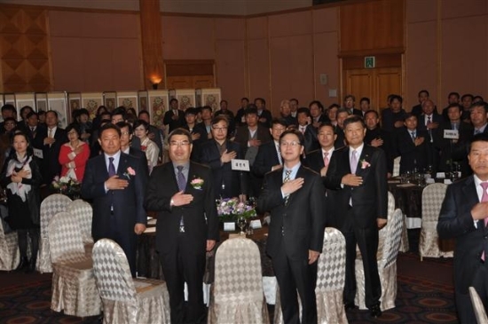 ▲ 지난 14일 열린 대한전문건설협회 전북도회장 이·취임식에서 이광한 신임회장 등 참석자들이 국민의례를 하고 있다.