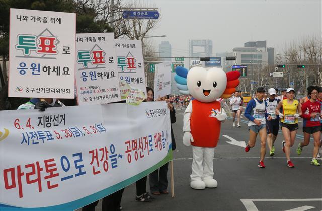 16일 오전 서울 종로4가 사거리에서 서울시선거관리위원회 직원들이 오는 6월 4일 실시되는 전국동시지방선거의 투표참여 홍보캠페인을 펼치고 있다. 연합뉴스