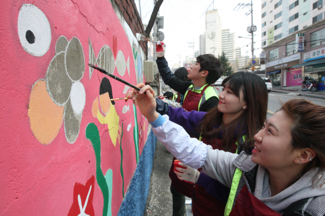 완연한 봄날씨를 보인 15일 전주 중화산동에서 전북 자원봉사 종합센터 회원들이 봄 맞이 벽화그리기 재능나눔 행사를 갖고 있다. 추성수chss78