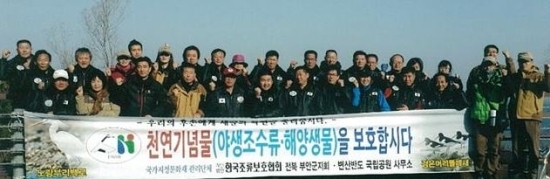▲ 지난 15일 (사)한국조류보호협회 부안군지회와 변산반도 국립공원사무소가 합동으로 하섬(변산면 마포리) 일대에서 자연보호 캠페인을 벌인 후 기념촬영을 하고 있다.