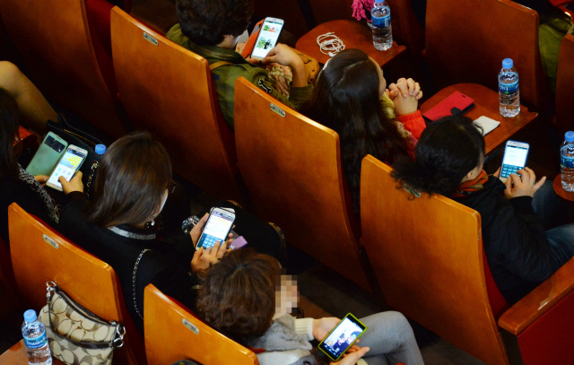 18일 전북교육문화회관에서 전주지역 유·초·중·고 특수학교 교장, 교감, 행정실장, 부장교사 대상으로 열린 2014 전주교육계획 설명회에서 참석자들이 스마트폰을 보면서 시간을 보내고 있다.