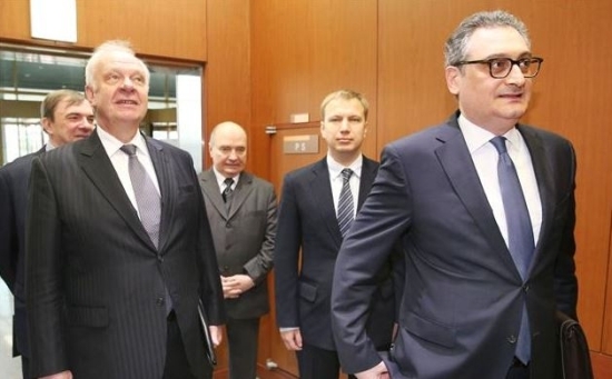 이고르 마르굴로프 러시아 외교부 아태담당 차관(맨 오른쪽)과 콘스탄틴 브누코프 주한러시아대사(맨 왼쪽) 등이 18일 오전 한·러 차관급 정책협의회에 참석하기 위해 도렴동 외교부로 들어서고 있다. 이번 회의에서 양국은 지난해 개최된 정상회담 후속조치 등 실질협력 확대 방안, 한반도 및 동북아 정세 등에 대해 의견을 교환할 예정이며 나진·하산 프로젝트 등 남북러 협력사업이 중점적으로 논의될 것으로 예상된다. 연합뉴스