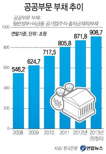 2003년 말 276조3000억원 수준이었던 공공부문 부채는 이후 매년 10% 안팎의 높은 증가율을 기록하며 10년 만에 3배로 불어났다.