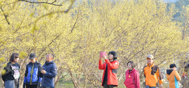 22일 산수유가 만개한 남원 용궁마을을 찾은 관광객들이 봄을 즐기고 있다. 남원 용궁마을 산수유 군락지는 100년 이상 수령을 자랑하고 있으며 29일부터 30일까지 축제가 열린다.