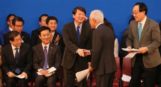 23일 오후 서울 동작구 대방동 서울여성플라자에서 열린 '새정치민주연합 서울특별시당 창당대회'에서 김한길 새정치민주연합 공동 창당준비위원장이 연설을 마친 뒤 안철수 위원장과 악수하고 있다. 왼쪽부터 박원순 서울시장, 오영식 서울시당 위원장, 안철수 위원장, 김한길 위원장, 이계안 서울시당 위원장. 연합뉴스