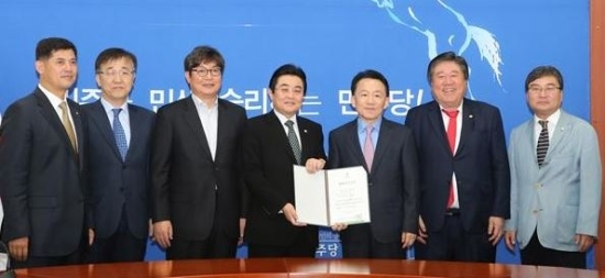 김완주 도지사는 21일 오전 국회 민주당 원내대표실에서 도내 국회의원들이 참석한 가운데 전병헌 민주당 원내대표에게 명예도민증을 수여했다. 전 원내대표는 지난해 6월 여야간 합의를 주도해 국민연금공단 기금운용본부의 전북 이전을 명시한 ‘국민연금법’개정안이 통과되는데 기여했다. 사진제공=전라북도