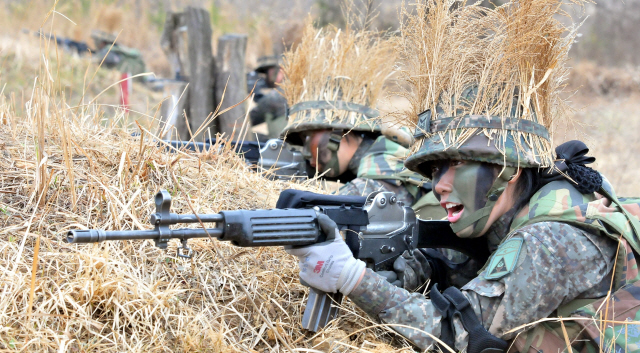 25일 익산 육군부사관학교에서 열린 실사격 공격전투훈련에서 여군하사가 “돌격, 분대 앞으로”를 외치고 있다. 실사격 공격전투훈련은 참호나 사로에서 안정적인 자세로 총을 쏘는 일반적인 사격훈련이 아닌 ‘각개전투’와 같이 병력들이 목표를 향해 전술적으로 기동하면서 각종 장애물을 극복하고 적을 향해 실제 사격하는 고강도의 실전적인 훈련이다.