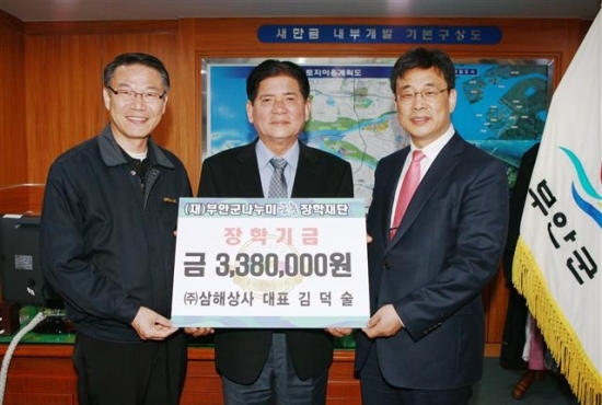 (주)삼해상사 (김덕술 대표이사 )는 26일 부안군청을 찾아 우수한 지역인재 양성에 써 달라며 부안군나누미근농장학재단에 장학금 338만원을 기탁했다.