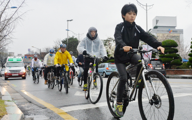 29일 전주시청에서 열린 ‘청춘 ’에 시민들이 봄비를 맞으며 자전거 페달을 밟고 있다.