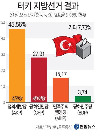 터키 반관영 아나돌루통신의 집계에 따르면 31일 오전 10시 개표율 98% 상황에서 집권 정의개발당(AKP)이 전국 득표율 45.6%를 기록해 제1야당인 공화인민당(CHP)의 27.9%를 크게 앞섰다.