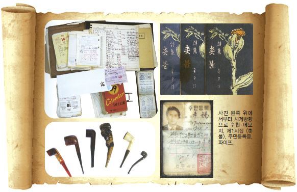 1970년 발급된 주민등록증, 빛바랜 앨범, 명함, 안경, 파이프, 지갑, 시계, 의류, 책장, 상패 등은 시인의 ‘흔적’으로 묶어졌다.