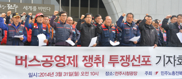 민주노총 전북본부는 지난 31일 전주시청 광장에서 “버스공영제 쟁취를 위해 선거기간 강력한 투쟁을 전개할 것”이라고 밝히고 구호를 외치고 있다.