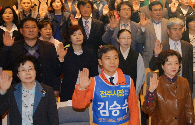 지난 31일 전주 전통문화의전당에서 열린 전북사회복지사대회에 김승수 전주시장 예비후보가 참석자들과 함께 사회복지사 선서를 하고 있다.