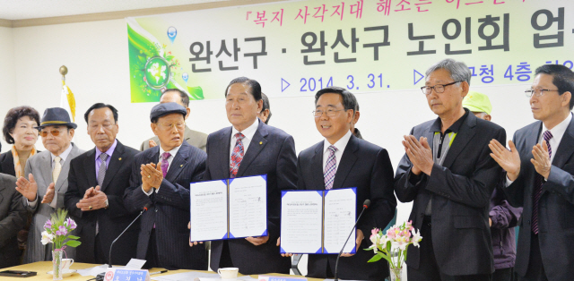 지난 31일 전주 완산구청 회의실에서 열린 복지사각지대 해소를 위한 완산구·완산구 노인회 업무협약식에 이기선 구청장과 오경남 노인회장이 협약식을 갖고 있다.