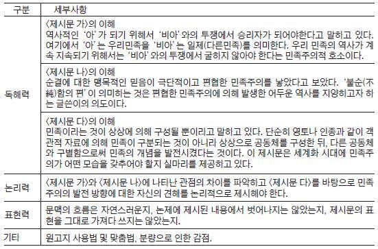 이번 논제의 요구사항은 두 가지 이다. 첫째, 〈제시문가〉와 〈제시문 나〉의 민족주의 관점을 비교하고 둘째, 〈제시문 다〉를 바탕으로 민족주의가 나아갈 방향을 제시하는 것이다. 민족공동체의 발전이라는 측면에서 〈제시문 가〉를 민족주의에 대한 긍정적 관점으로 보고, 〈제시문 나)는 편협한 민족주의의 폐단을 제시함으로써 민족주의에 대한 부정적 관점을 드러낸다. 더불어 〈제시문 나〉의 불순함에 대한 용인만으로는 민족주의의 부정적 측면을 근본적으로 해결할 수 없다고 제시하였다. 마지막 문단에서는 〈제시문 다〉를 바탕으로 인류의 보편적 가치인 인권과 평화를 제시함으로써 민족주의가 앞으로 나아가야할 방향으로 설득력 있게 제시하였다.