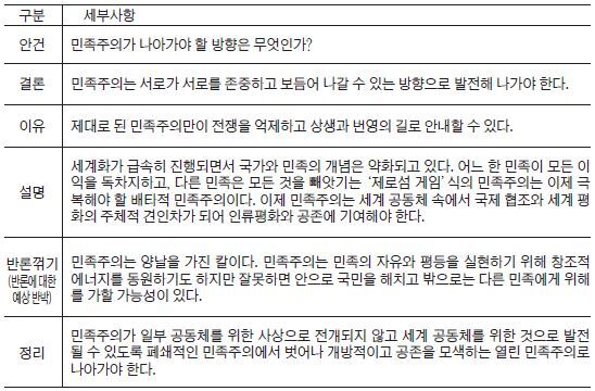 이번 논술문의 주제는 ‘민족주의 어떤 방향으로 발전되어야 하는가?’이다. 민족주의는 양날을 가진 칼이다. 민족주의는 민족의 자유와 평등을 실현하기 위해 창조적 에너지를 동원하기도 하지만 잘못하면 안으로는 국민을 해치고 밖으로는 다른 민족에게 위해를 가할 가능성이 있다.